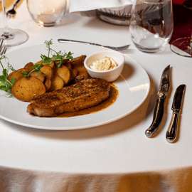 Rib Eye steak met kruidenboter en huisgemaakte chips / Vegetarische optie: bloemkoolsteak met chimichurri en huisgemaakte chips